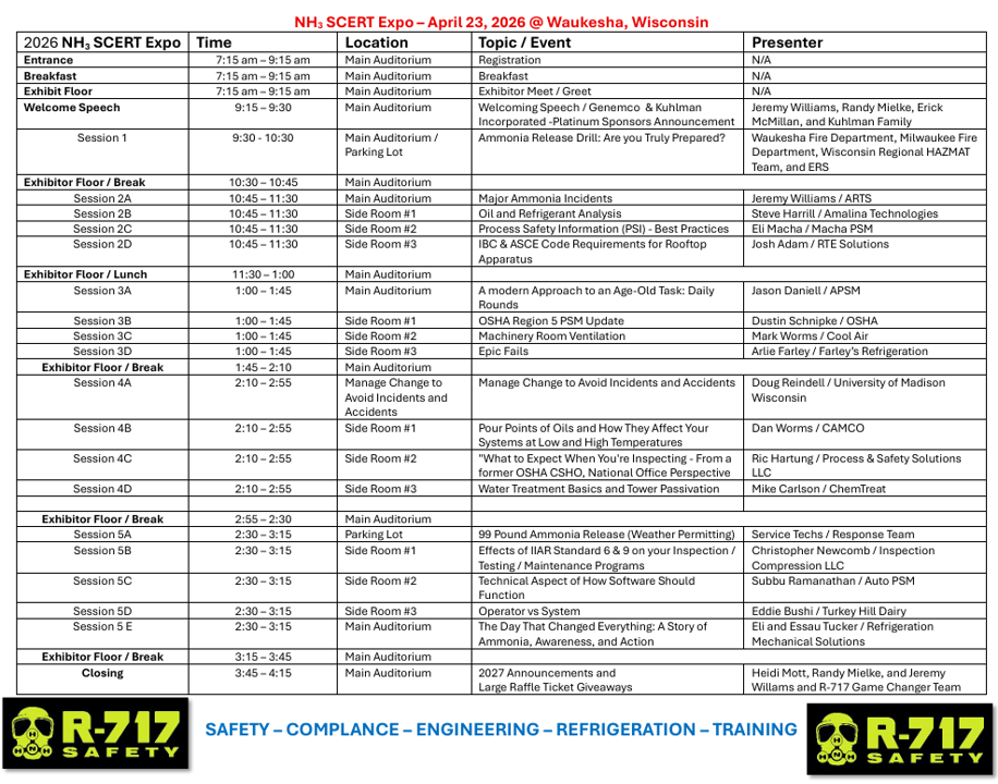 The 2026 NH3 SCERT Expo is shaping up to be one of the most hands-on, real-world ammonia safety events in the country. From live ammonia release drills with local fire departments to OSHA Region 5 updates, major incident case studies, machinery room ventilation, MOC best practices, and even a 99-pound ammonia release demo — this day is built for operators, managers, engineers, and safety professionals who want more than just slides on a screen. Register today at this link!