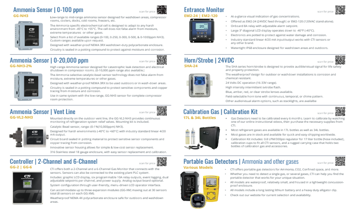 Following is a discussion of ammonia detection system design for facilities utilizing ammonia refrigeration systems. Regulations for the ammonia refrigeration industry have dramatically changed in the last 10 years. Beginning with 2021 editions of the Uniform, International, NFPA, and ASHRAE codes and standards, you only need to consider recommendations from IIAR when you evaluate your ammonia detection system for compliance. In addition to IIAR standards, you should always consider any local amendments or supplemental requirements of your AHJ, RAGAGEP, and your insurance company. Many insurance carriers impose their own requirements to mitigate the risk of loss of life and product in a facility. What follows is a system design that meets the requirements all of the above-mentioned influences. This document is updated periodically, and it is recommended that you check our website (www.ctiengineering.com) for the latest revision.