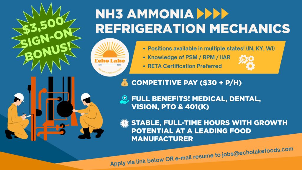 See link with complete job description. Operate, monitor, and maintain ammonia refrigeration systems (high and low pressure), compressors, condensers, evaporators, and associated controls. Perform preventative and corrective maintenance on NH₃ systems in accordance with PSM/RMP, IIAR.